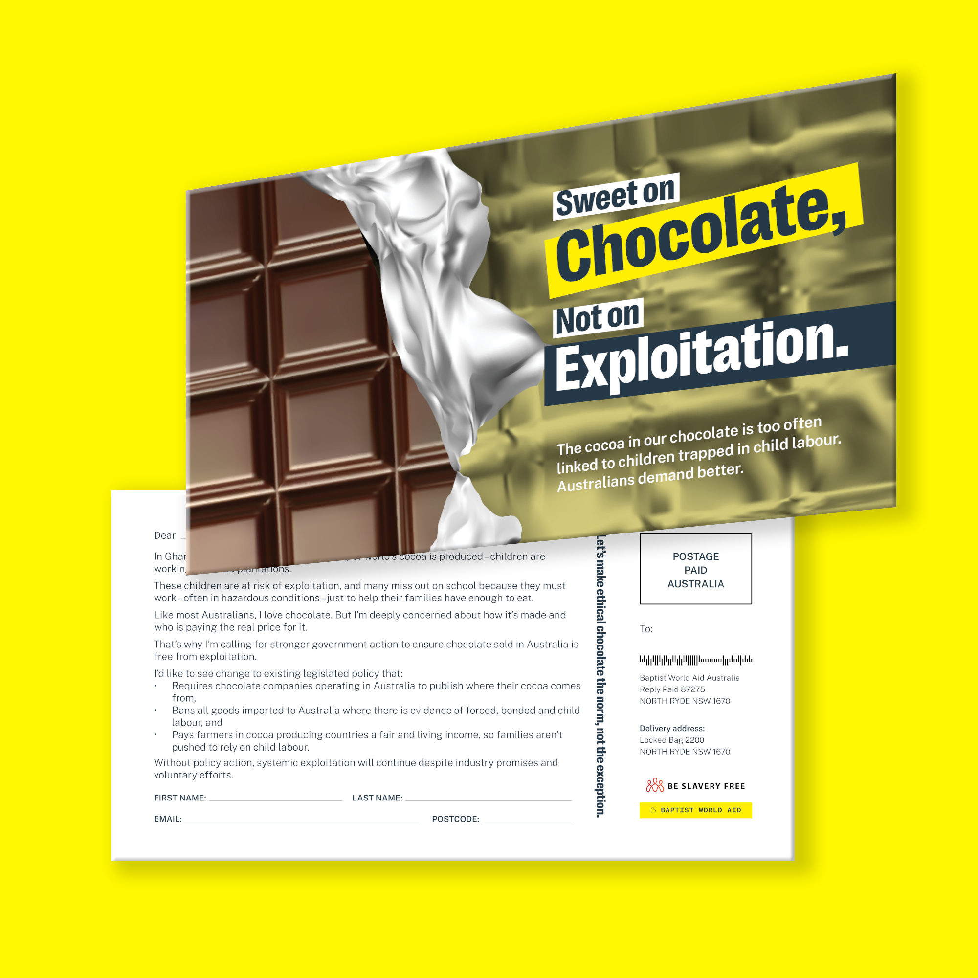 Invite those within your church, school or community group to sign a postcard asking the Government to make policy changes that better protect children against exploitation in the cocoa industry, and ensure farmers earn a fair wage.