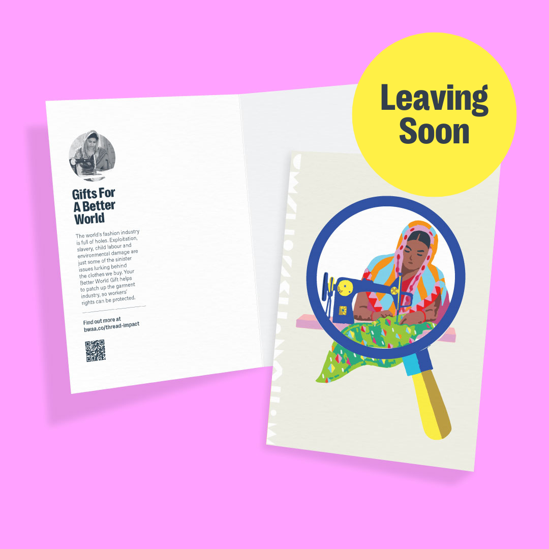Many of them are hidden from view in the early stages of production, or in sub-contracted factories where the risks of exploitation are greatest. When you buy a Make Your Thread Count card, you support vital work that challenges well-known fashion brands to trace their whole supply chain, and strengthen measures that ensure workers are paid fairly and not subject to abuse or exploitation.